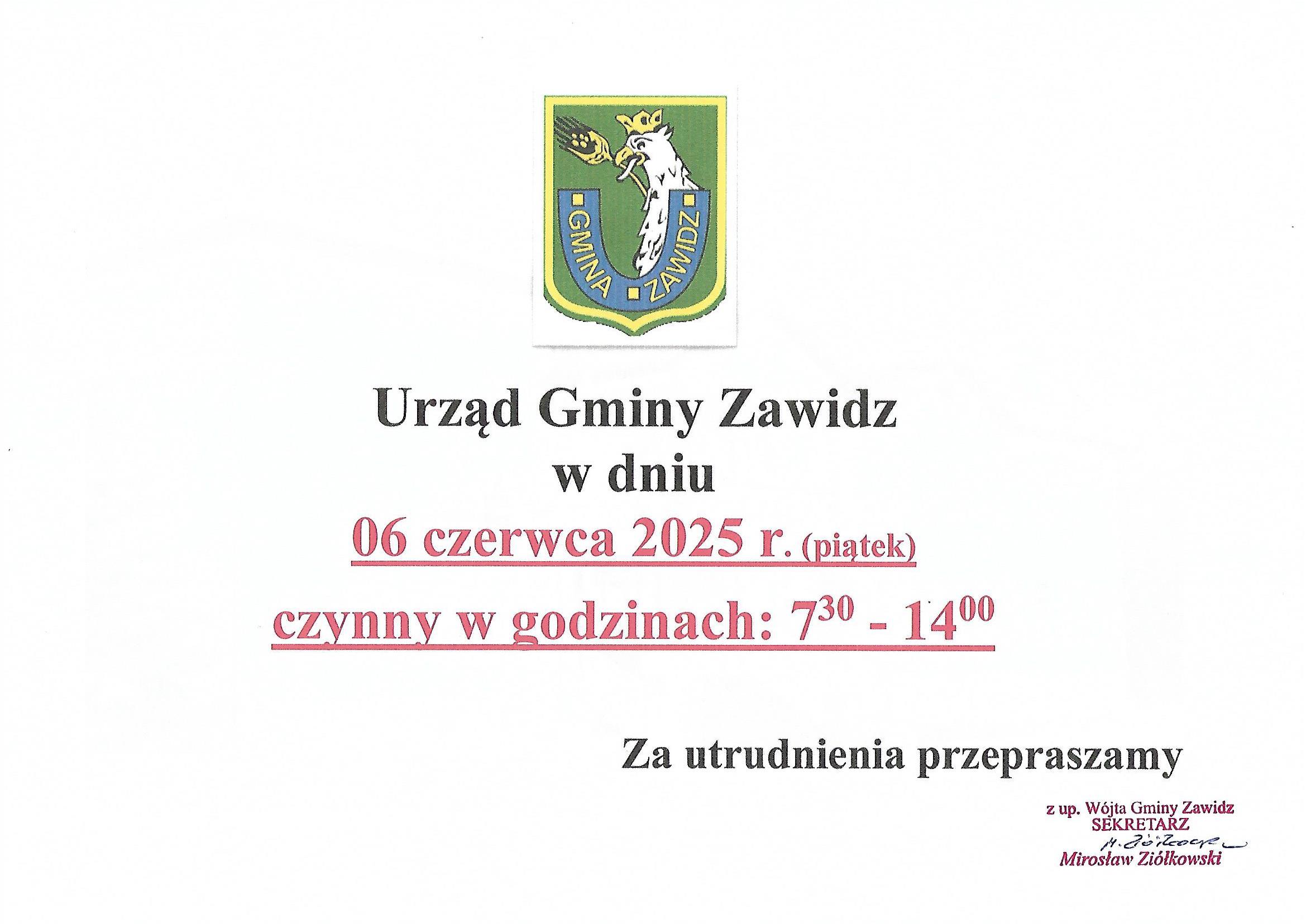 6 czerwca 2025 r. Urząd Gminy Czynny do godz. 14:00