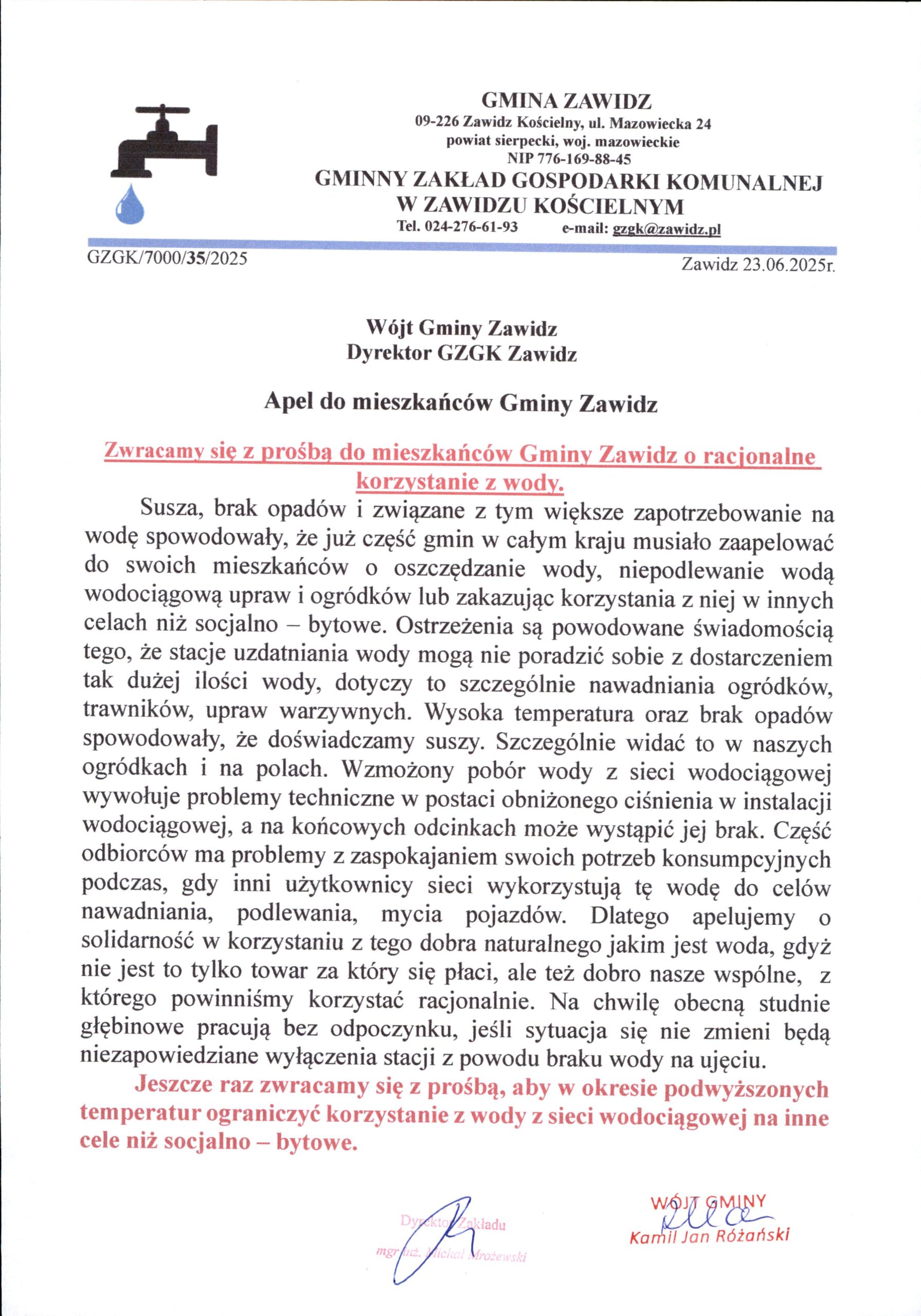 Prośba do mieszkańców o racjonalne korzystanie z wody