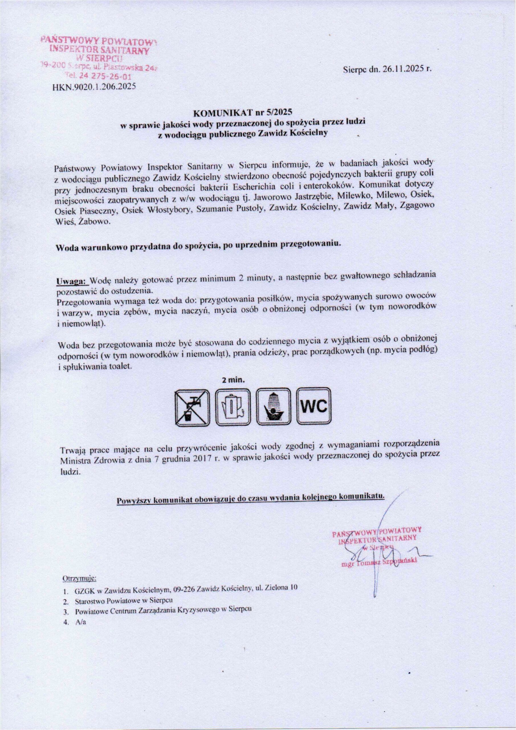 Komunikat Państwowego Powiatowego Inspektoratu Sanitarnego w Sierpcu dotyczący jakości wody