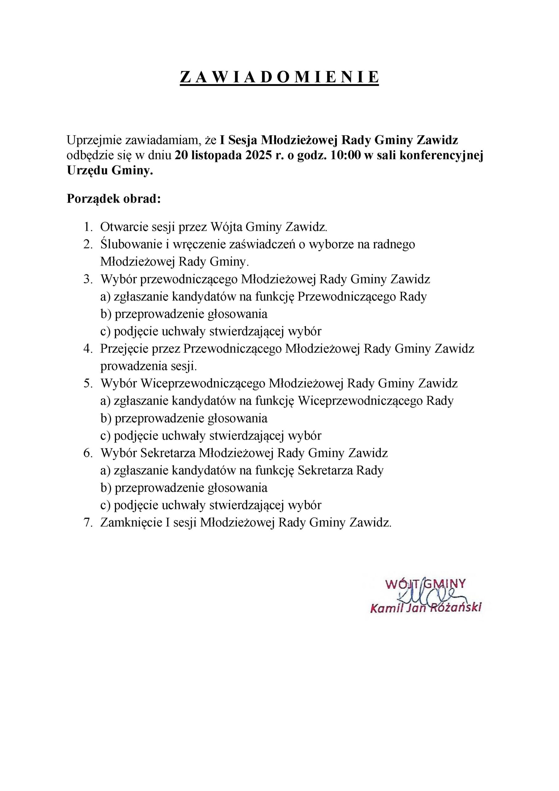 Zaproszenie na I Sesję Młodzieżowej Rady Gminy Zawidz